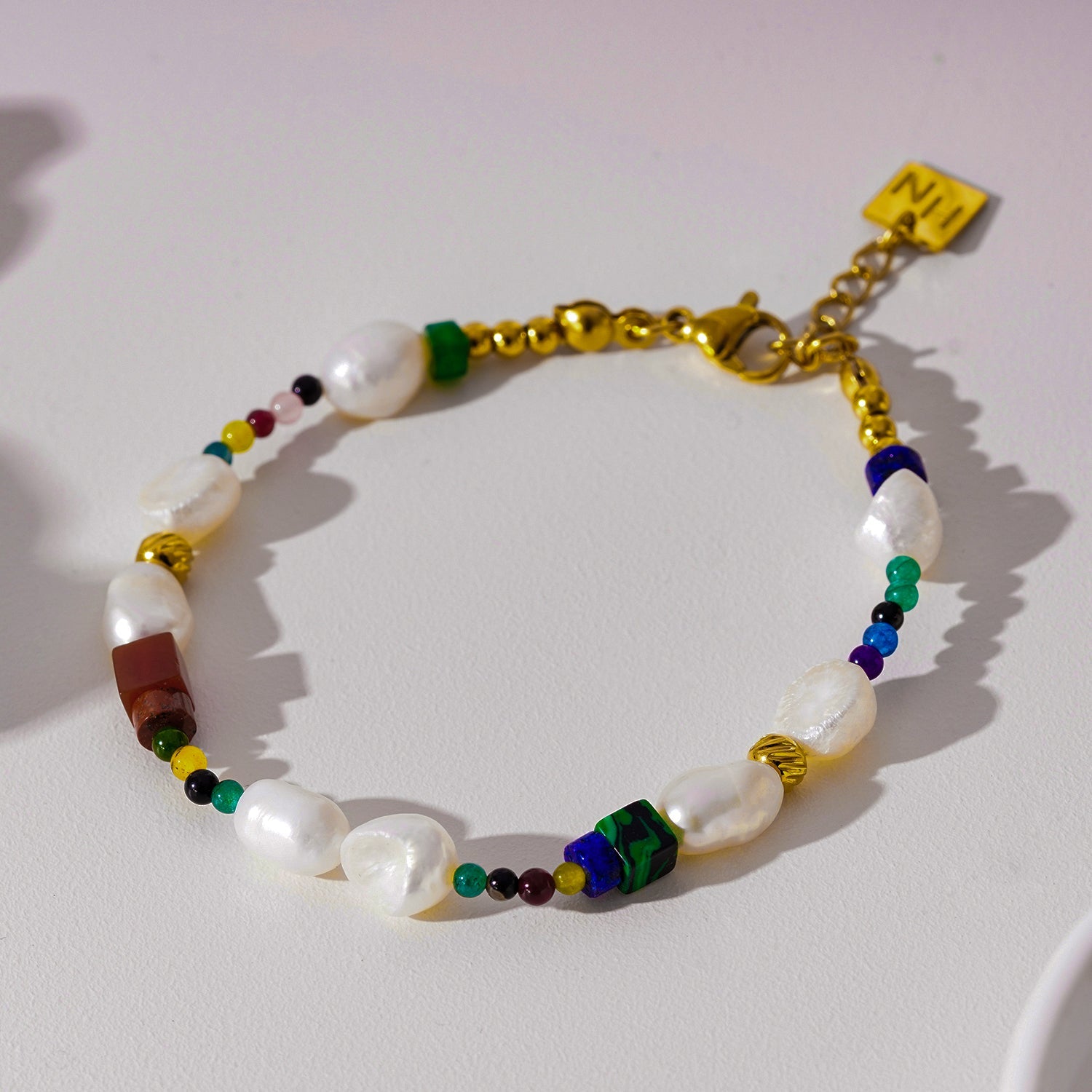 Crafted with meticulous attention to detail, each gold bead is carefully placed to provide a touch of luxe to the bracelet, while the colorful natural stones infuse a burst of energy and warmth reminiscent of California's vibrant spirit. The inclusion of freshwater pearls adds a touch of timeless sophistication, creating a perfect balance between bohemian flair and classic charm.