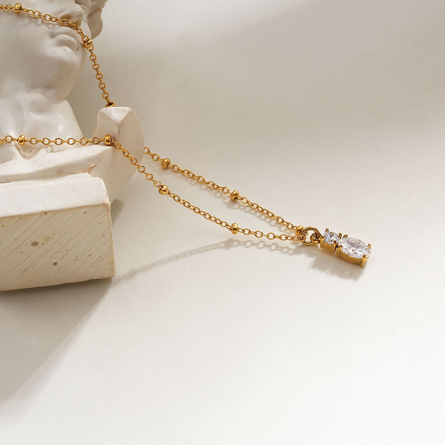 An elegant necklace showcasing a pair of elegant zirconia pendants, creating a mesmerizing play of light & bringing a brilliant element to your look.