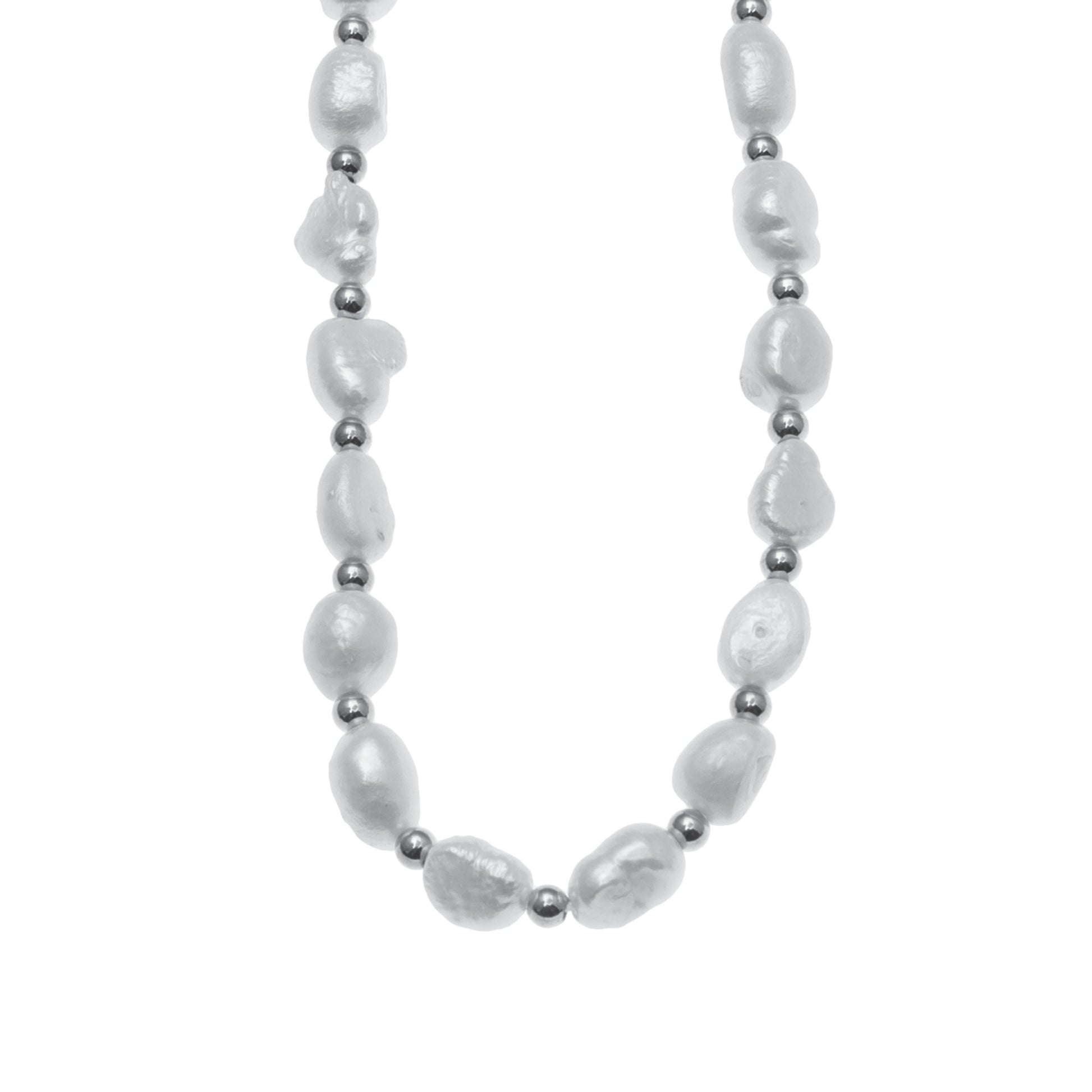 Drape yourself in luxury with this chain necklace featuring captivating freshwater pearls and gleaming white gold (silver toned) ball-beads. This accessory encapsulates the essence of opulence and modern allure.