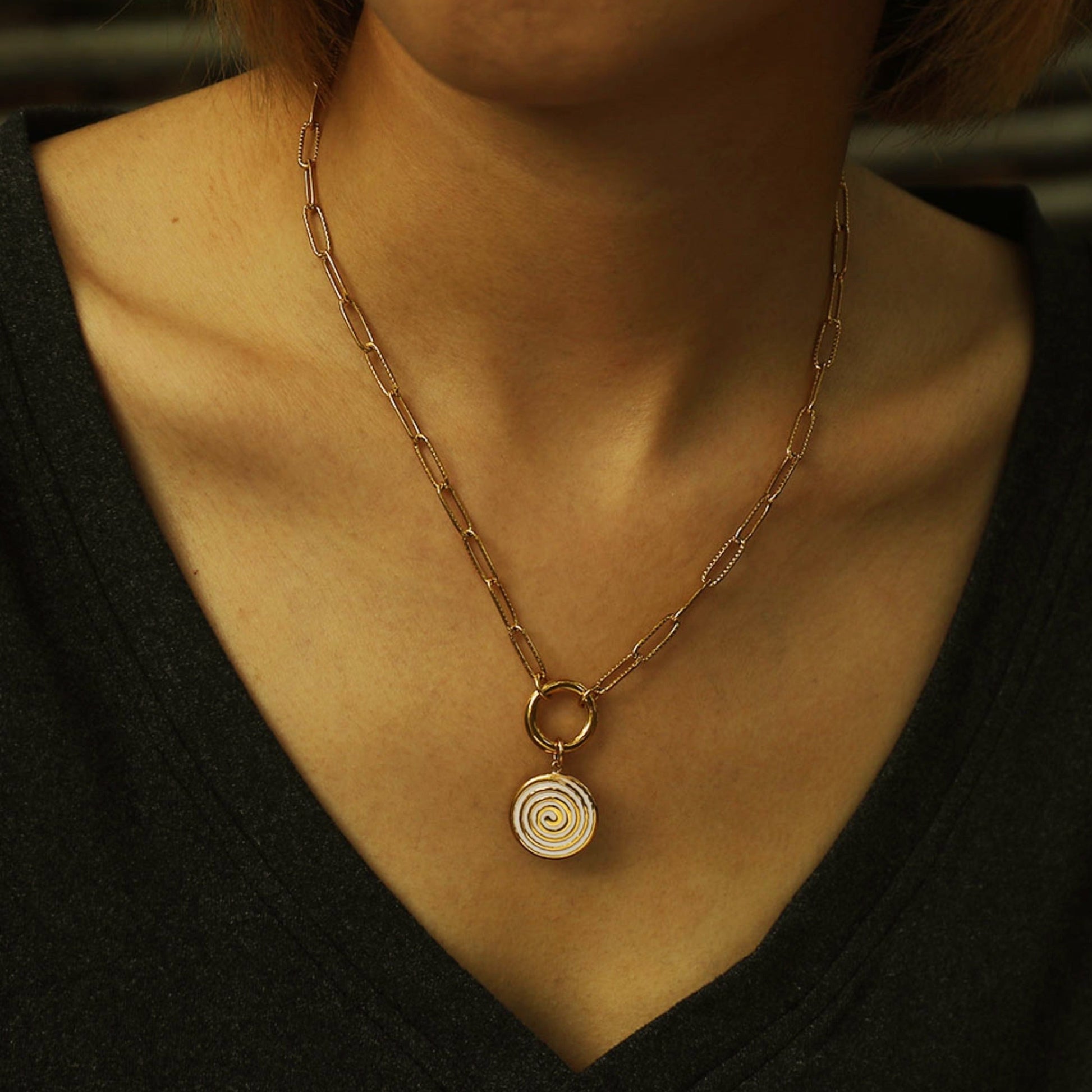 A contemporary textured chain-linked necklace with an enamel spiral design pendant charm, in a striking colour combination of gold and white. Add some subtle sophistication to your style.