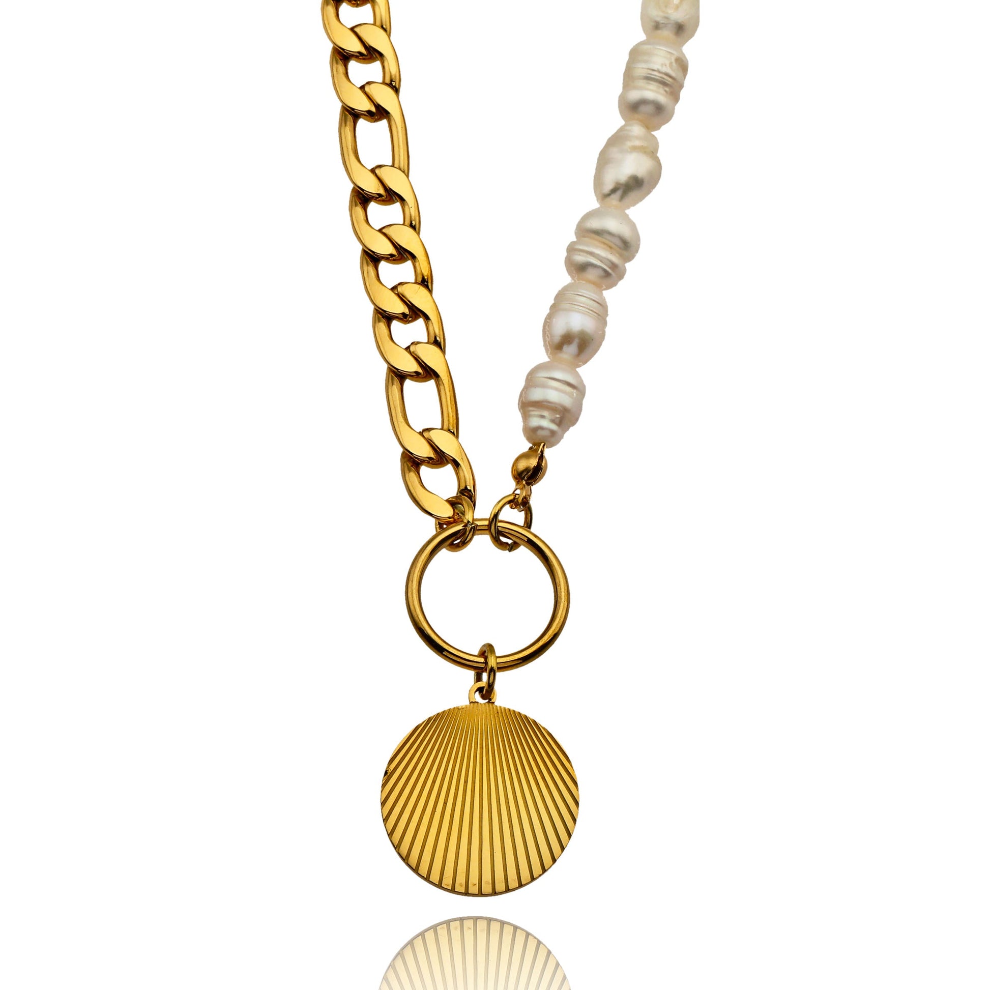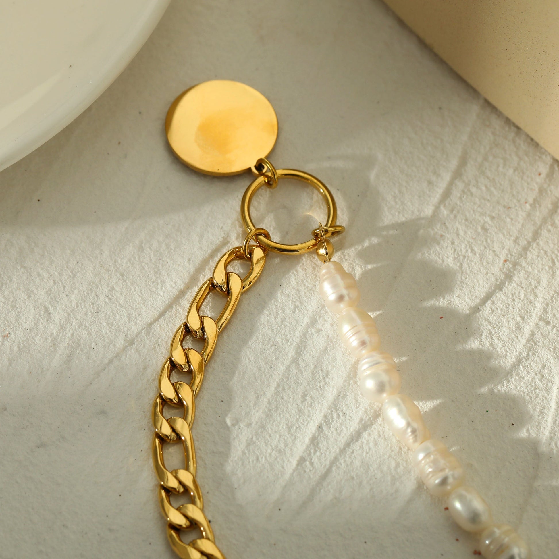 Elevate your look with this multi-media necklace: mixed chains, a string of fresh-water natural pearls, and a minimalist engraved pendant anchored by a circle stopper, all come together to make a statement piece that will make you stand out from the crowd.