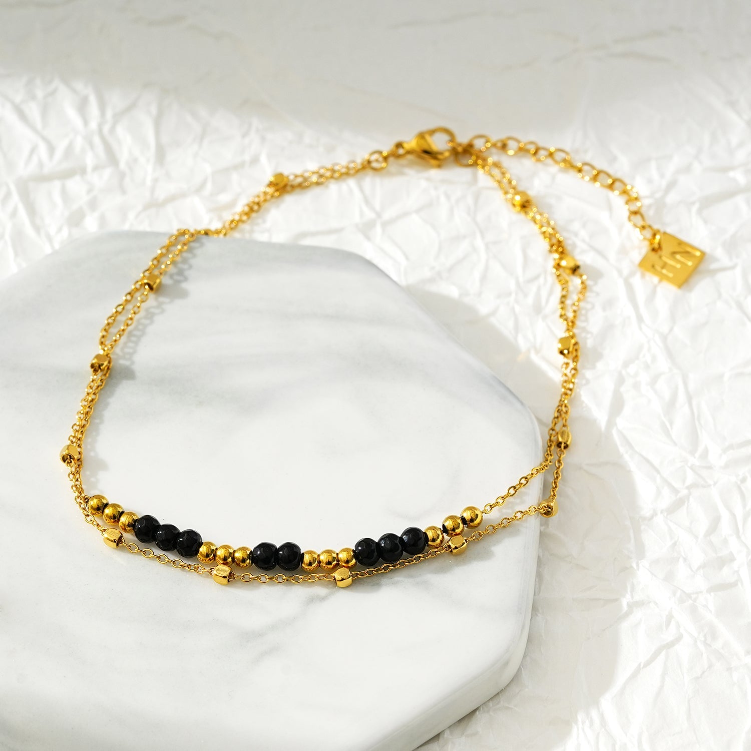 HILDA LG: Two-in-One Square Beads & Round Beads in Black & Gold Anklet.