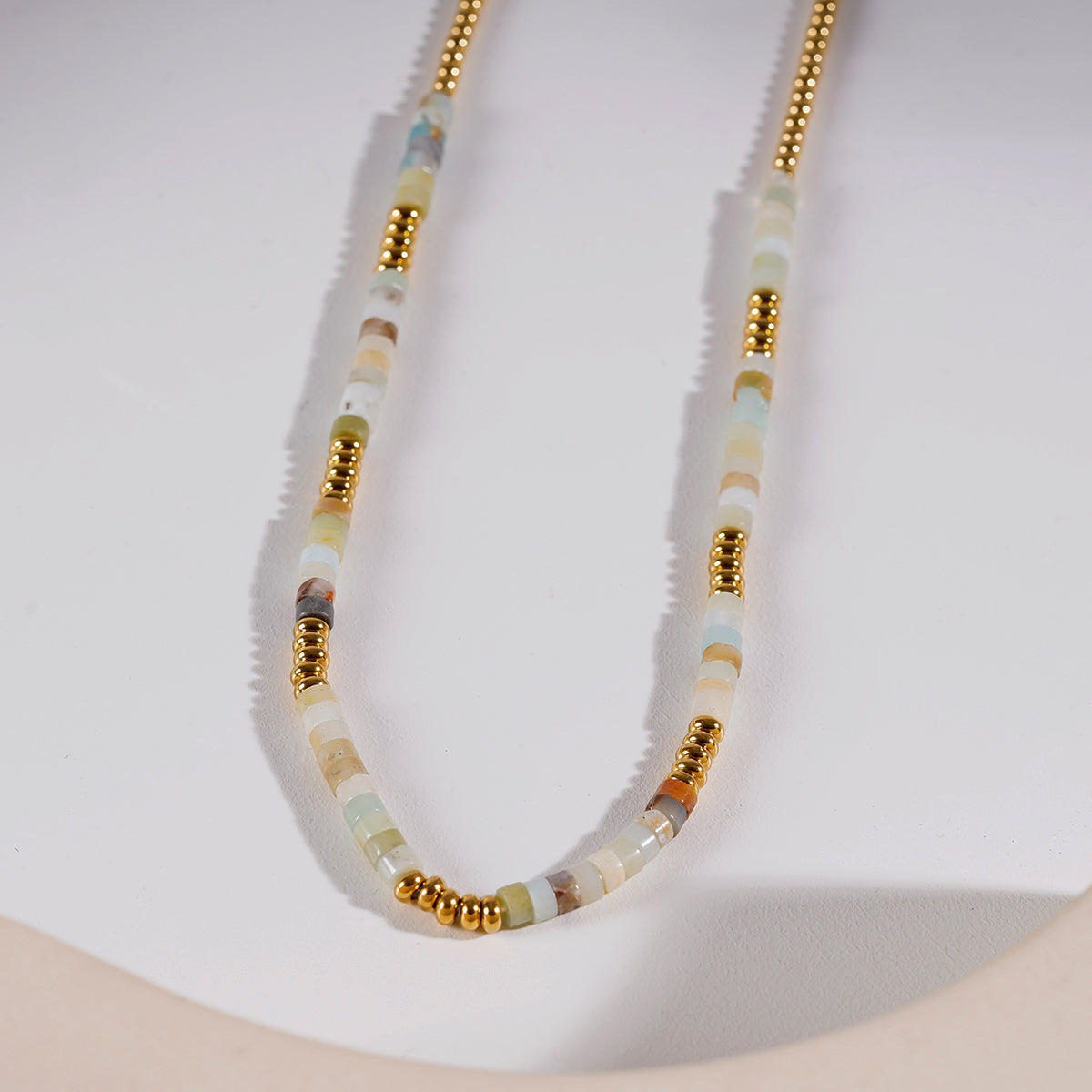 Experience a distinctive blend of modern design and boho chic in this one-of-a-kind necklace. Enhance your daily style with this captivating accessory, seamlessly marrying the natural charm of Pink Aventurine with the luxurious touch of gold beads.