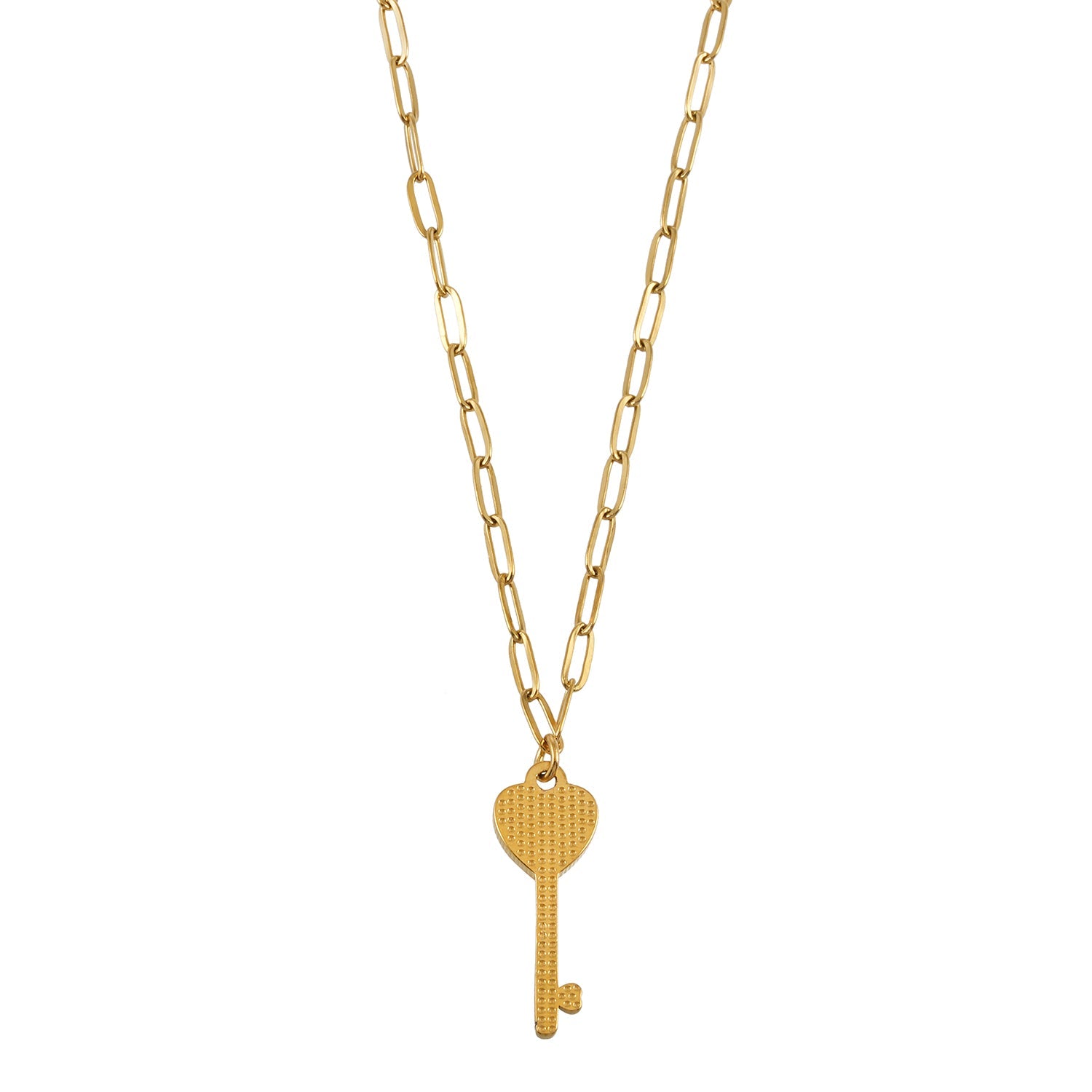 JAZRINA Gold: Pavé Key & Heart Pendant on a Paper Clip Chain Necklace