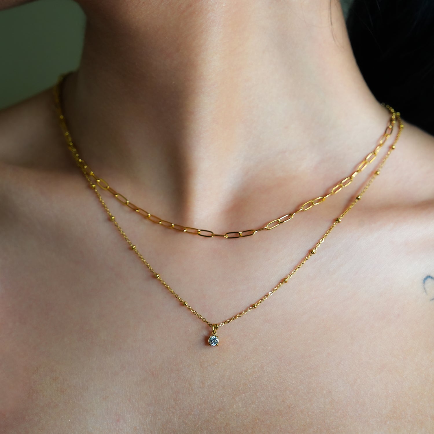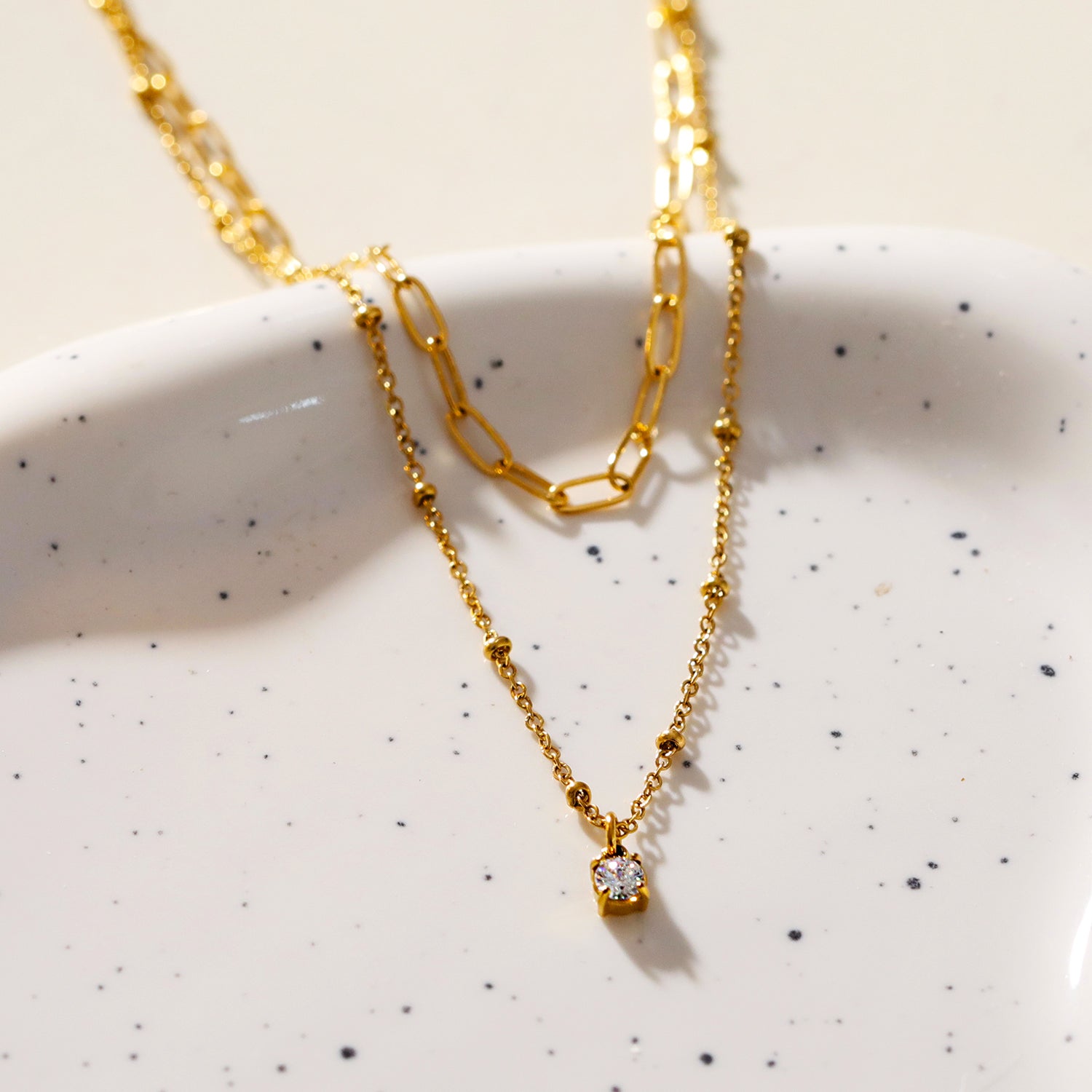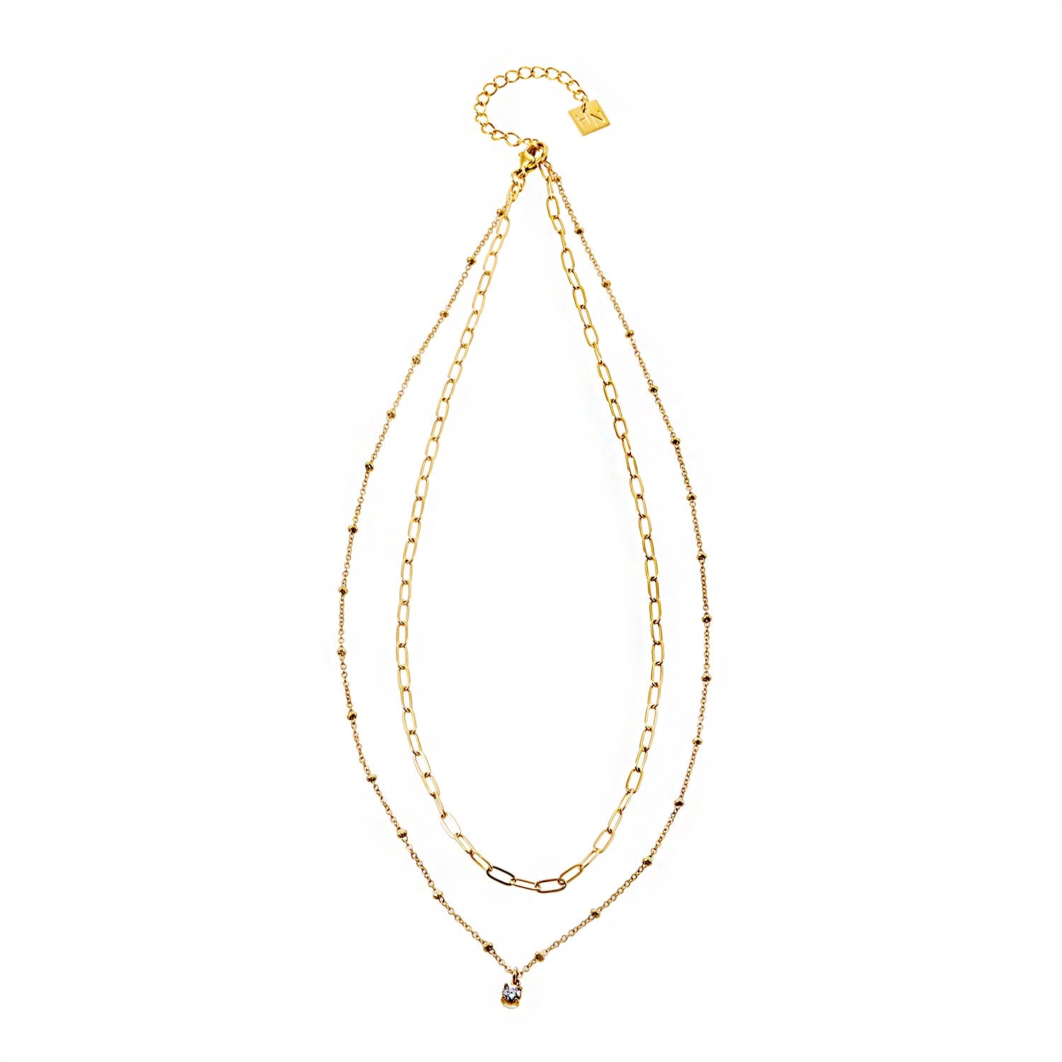 A single zirconia charm glints on a contemporary effortless layered necklace, encompassing a paper clip chain and a beaded chain. Style perfect from AM to PM.