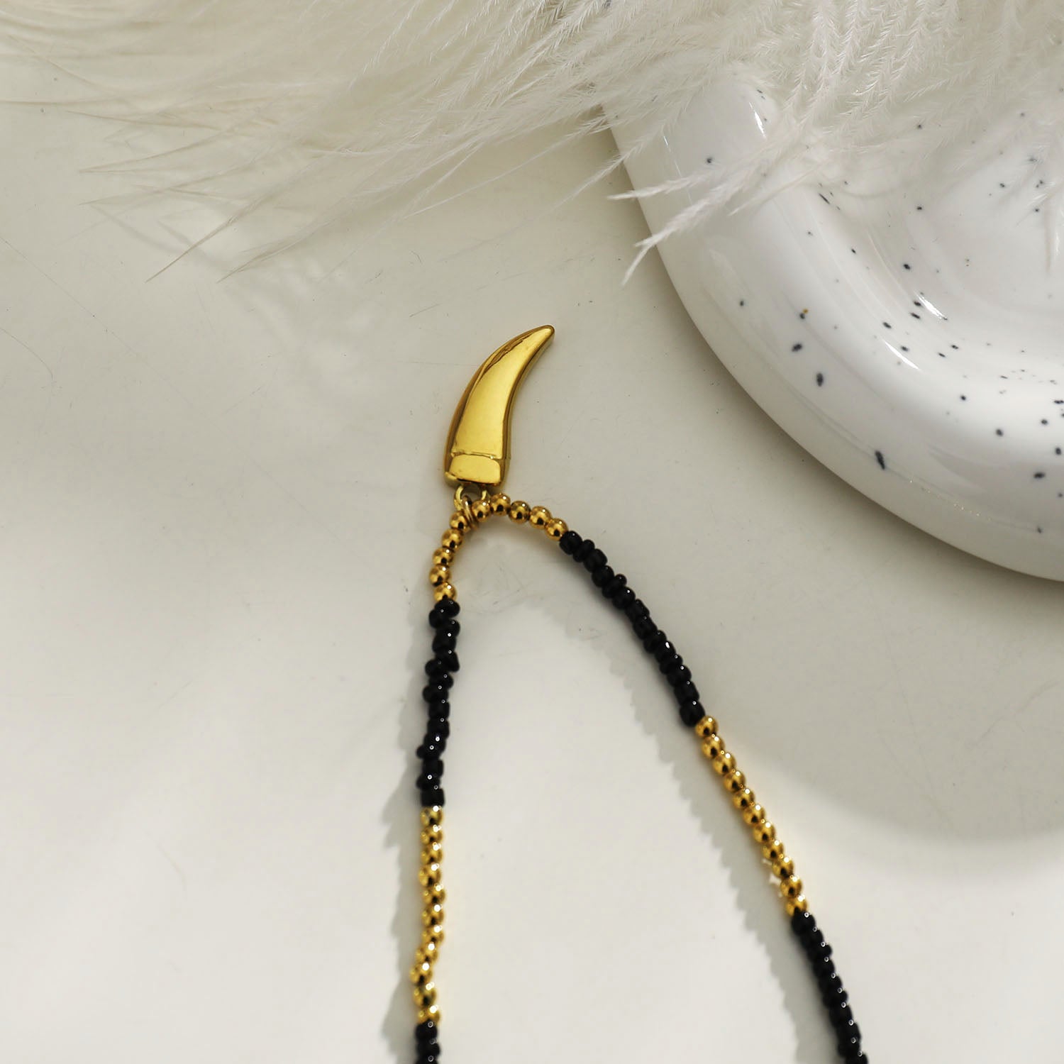 RITA Black & Gold Beaded Chain Necklace with Etched Gold Tooth Pendant