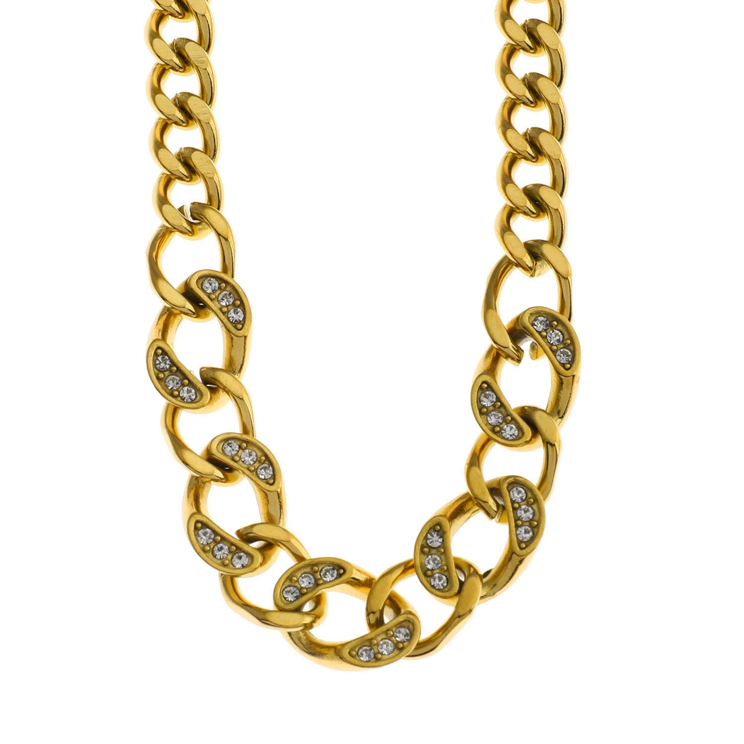 An arresting blend of style and substance characterise this eye-catching statement necklace. Two sizes of Cuban chain-links combine together, with the larger one embedded with shiny Zirconia gemstones. Perfect for the It Girl about town. Ideal for any occasion where style is mandatory.