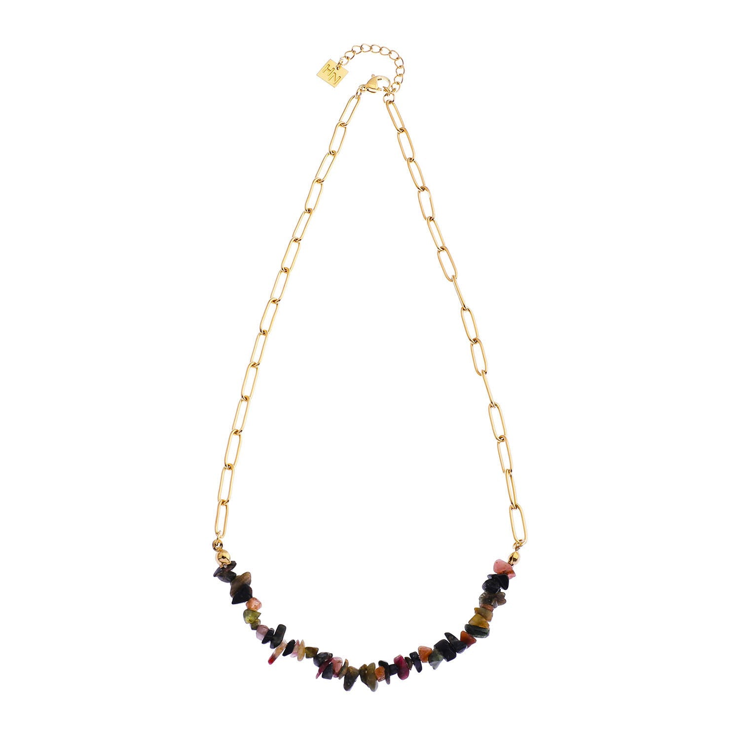 A bevy of Tourmaline gemstones inject color & natural beauty onto a contemporary paper-clip chain necklace. This combination necklace is the perfect way to a pop of style to your look.