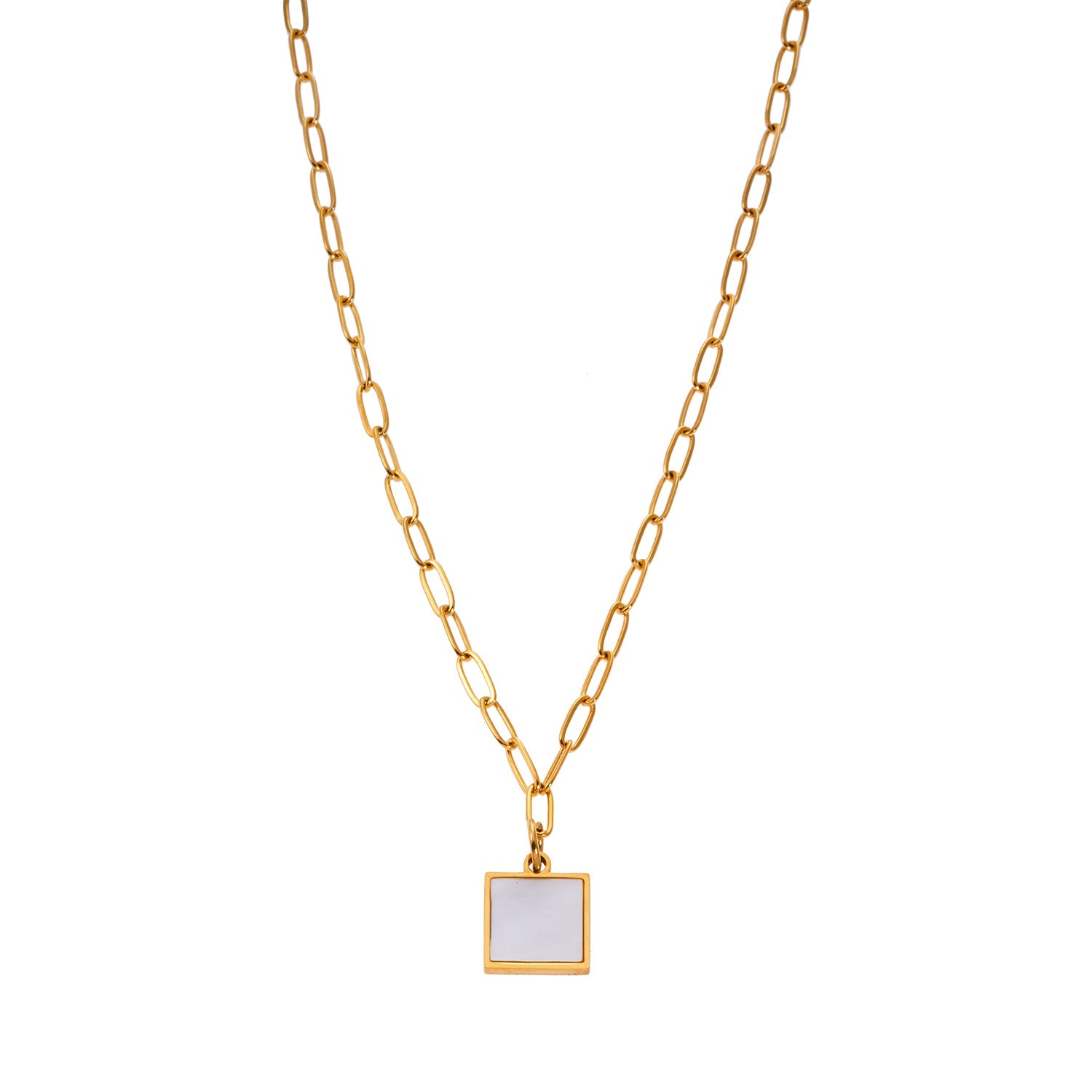 Style ANNABELLA: Minimalist Metal & Shell Square Pendant on a Paper-Clip Chain Necklace.