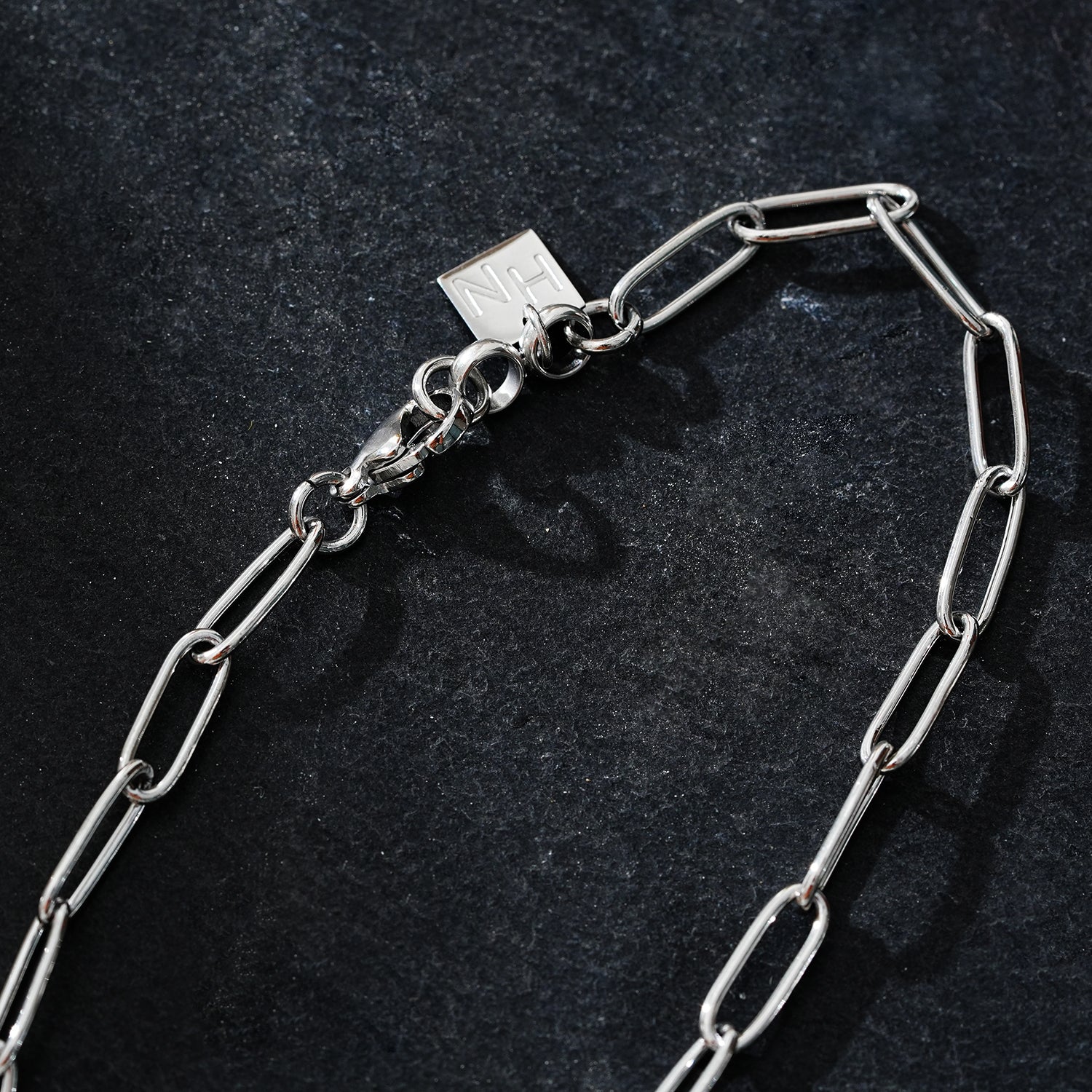 Update your jewelry collection with our Essential Silver Chain Link Paper-Clip Necklace, a timeless piece designed for those who appreciate understated elegance. Crafted in 18K white gold, this 22" necklace combines the classic charm of silver with the luxurious sheen of white gold, creating a versatile accessory that complements any style.