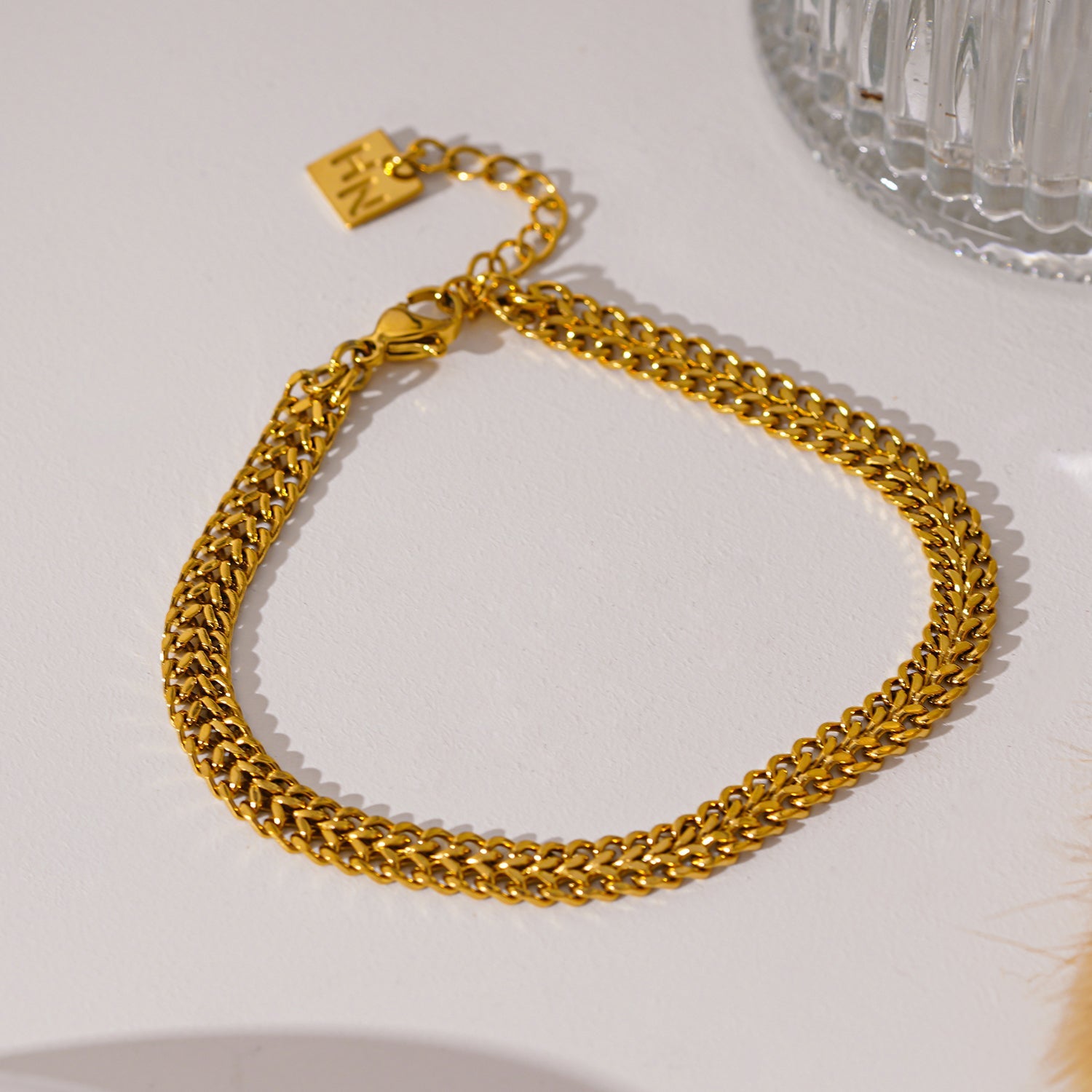 This bracelet is a stunning display of intricacy, featuring a unique singular twin chain design that sets it apart from traditional styles. Each link is meticulously crafted to create a sense of fluidity and movement, adding an element of elegance to any ensemble.