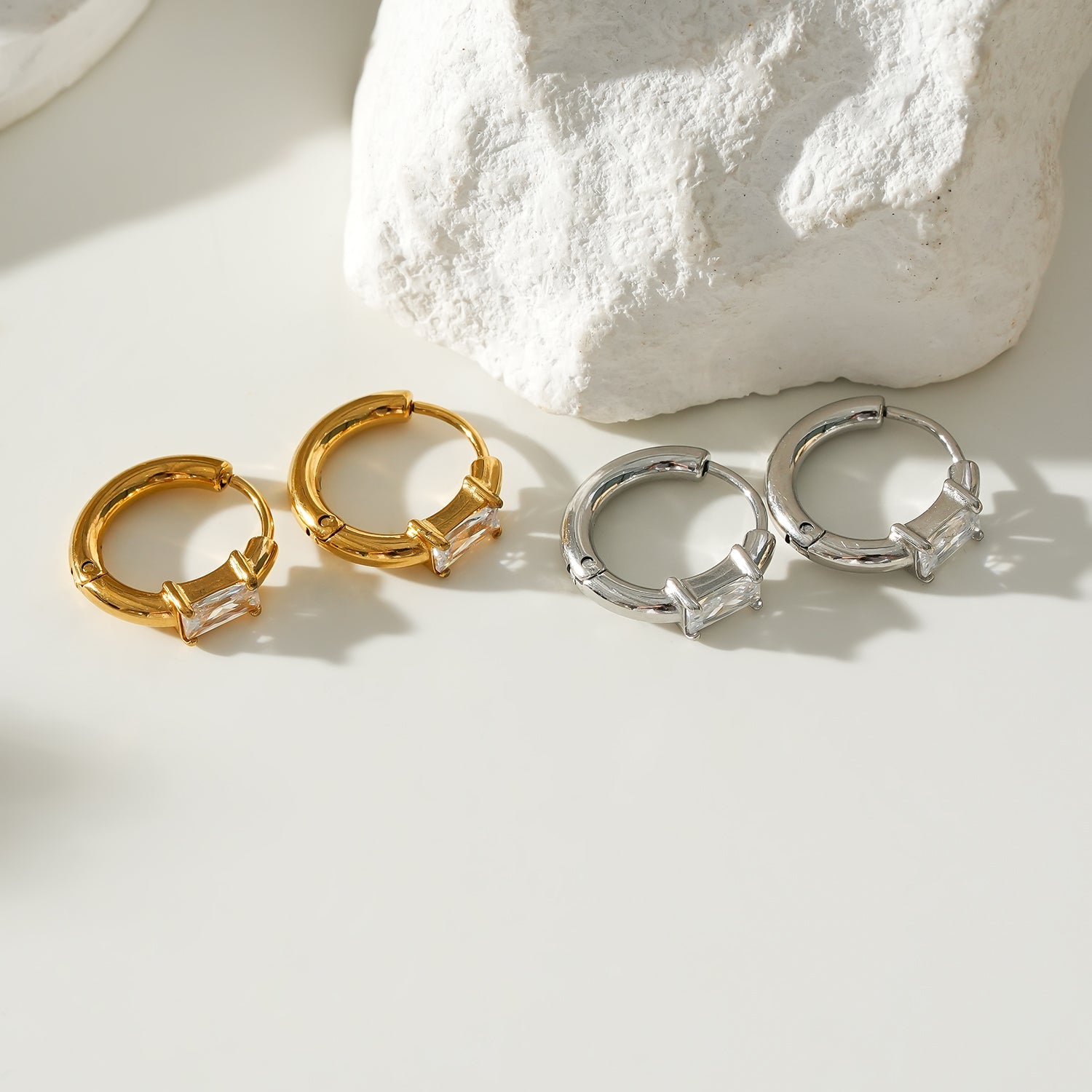 Add a touch of elegance to your look with these rectangle encased mini clear zirconia anchored on a hoop. Subtle, pretty and eye-catching; perfect for any outfit.