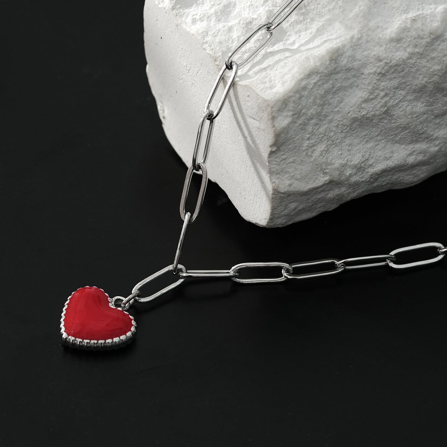 Elevate your style with our stunning paper-clip chain necklace featuring a heart-shaped pendant crafted from an 18K white gold-infused alloy and layered with rich red enamel. This exquisite piece is designed to add a touch of romance and sophistication to any look.