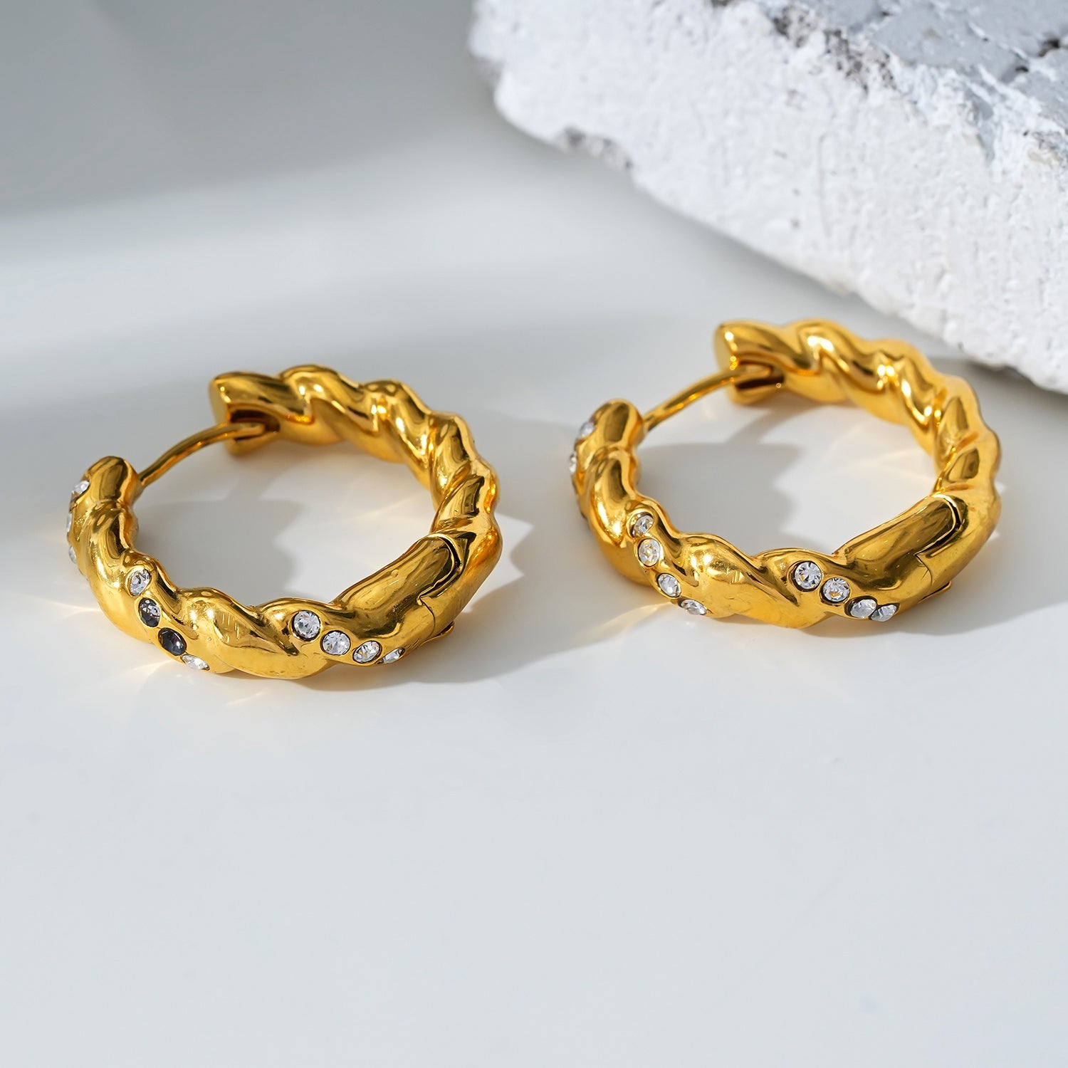 Style KAMENZ: Twisted Textured Hoop Earrings with Zirconia Embellishments.