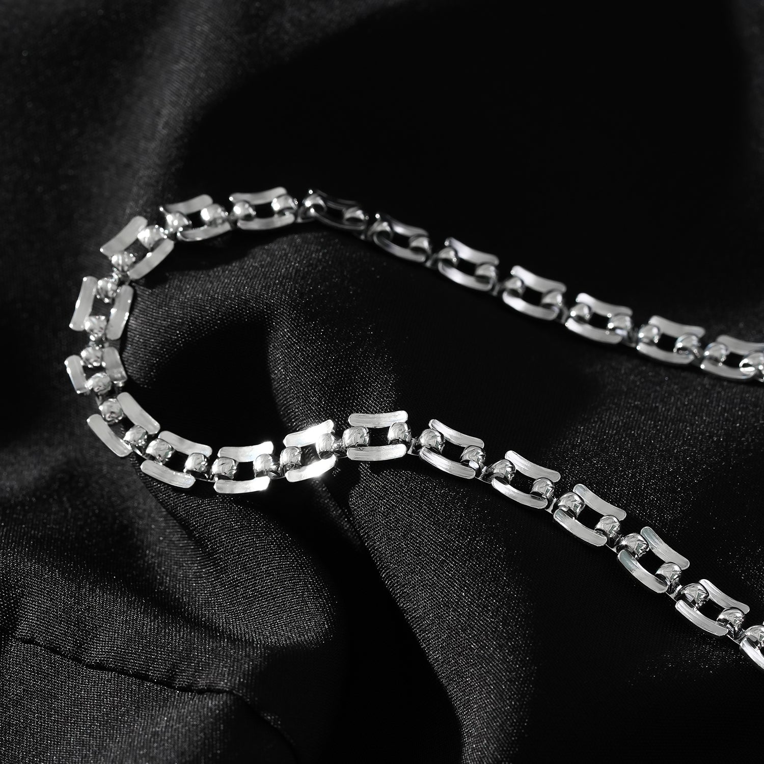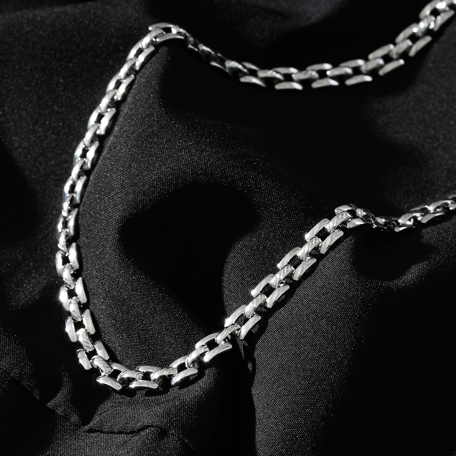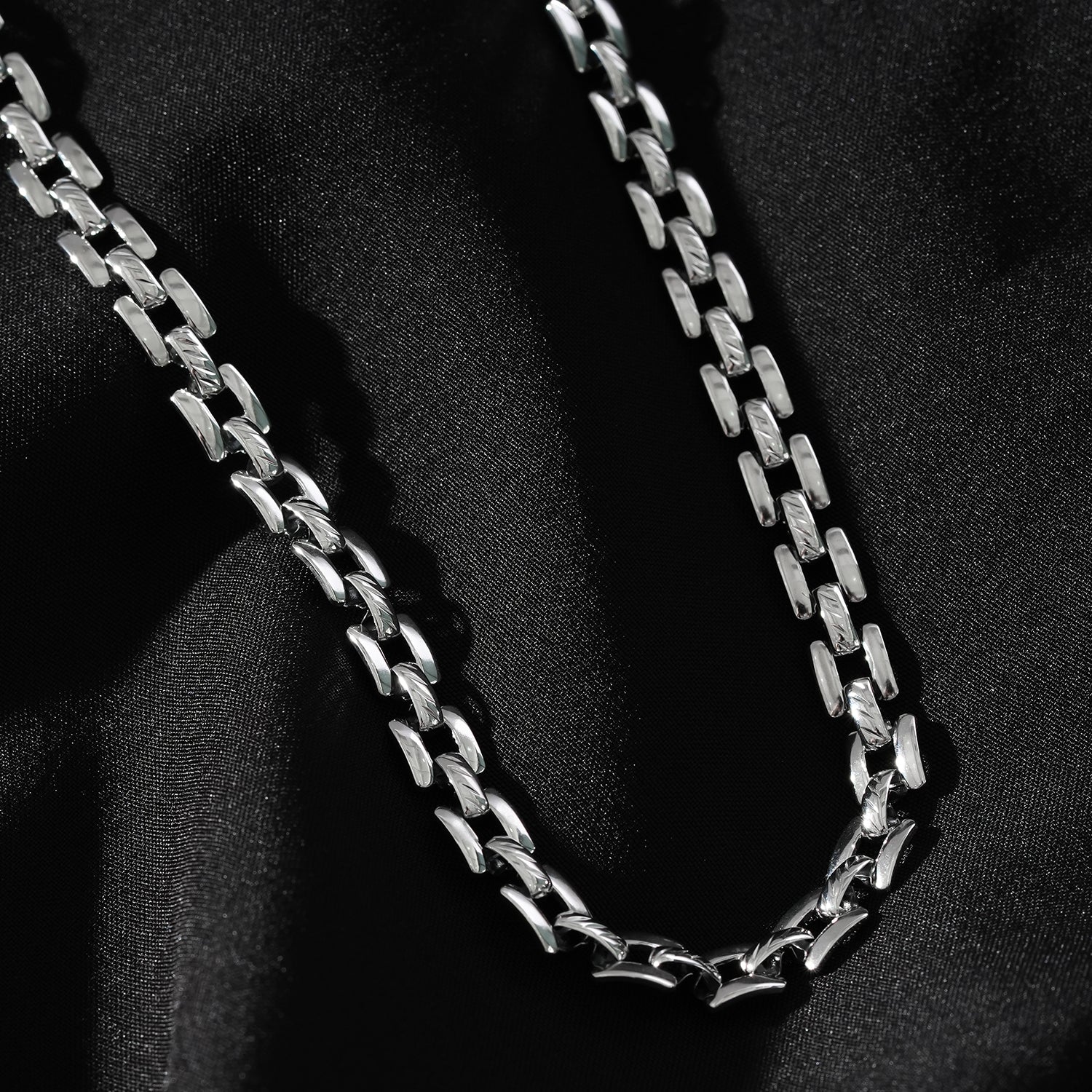 This necklace showcases a stunning display of intricacy with its unique twin-chain design, setting it apart from traditional styles. Each link is meticulously crafted to create a fluid and dynamic sense of movement, adding a touch of elegance to any ensemble.