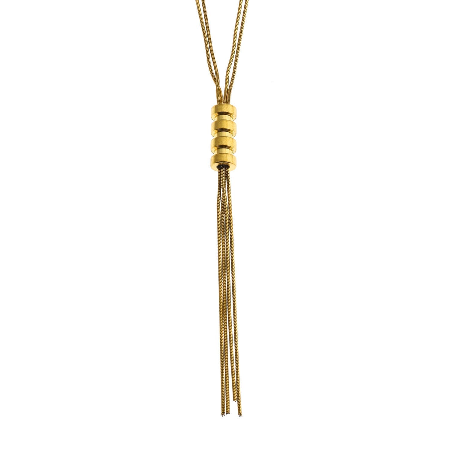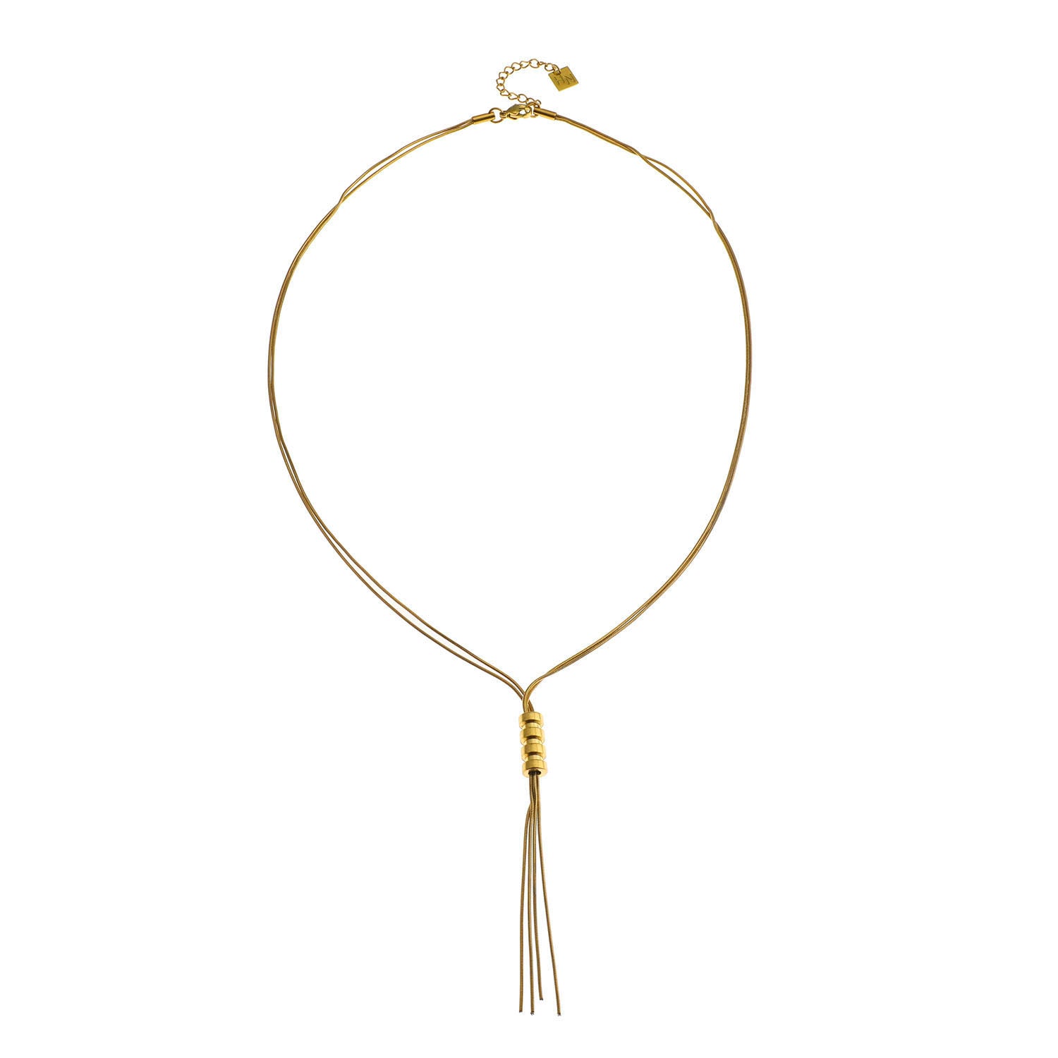 A bevy of geometric beads anchor this lariat-style necklace crafted in snake-skin textured chains. Shine and shimmer in style with this classic piece.