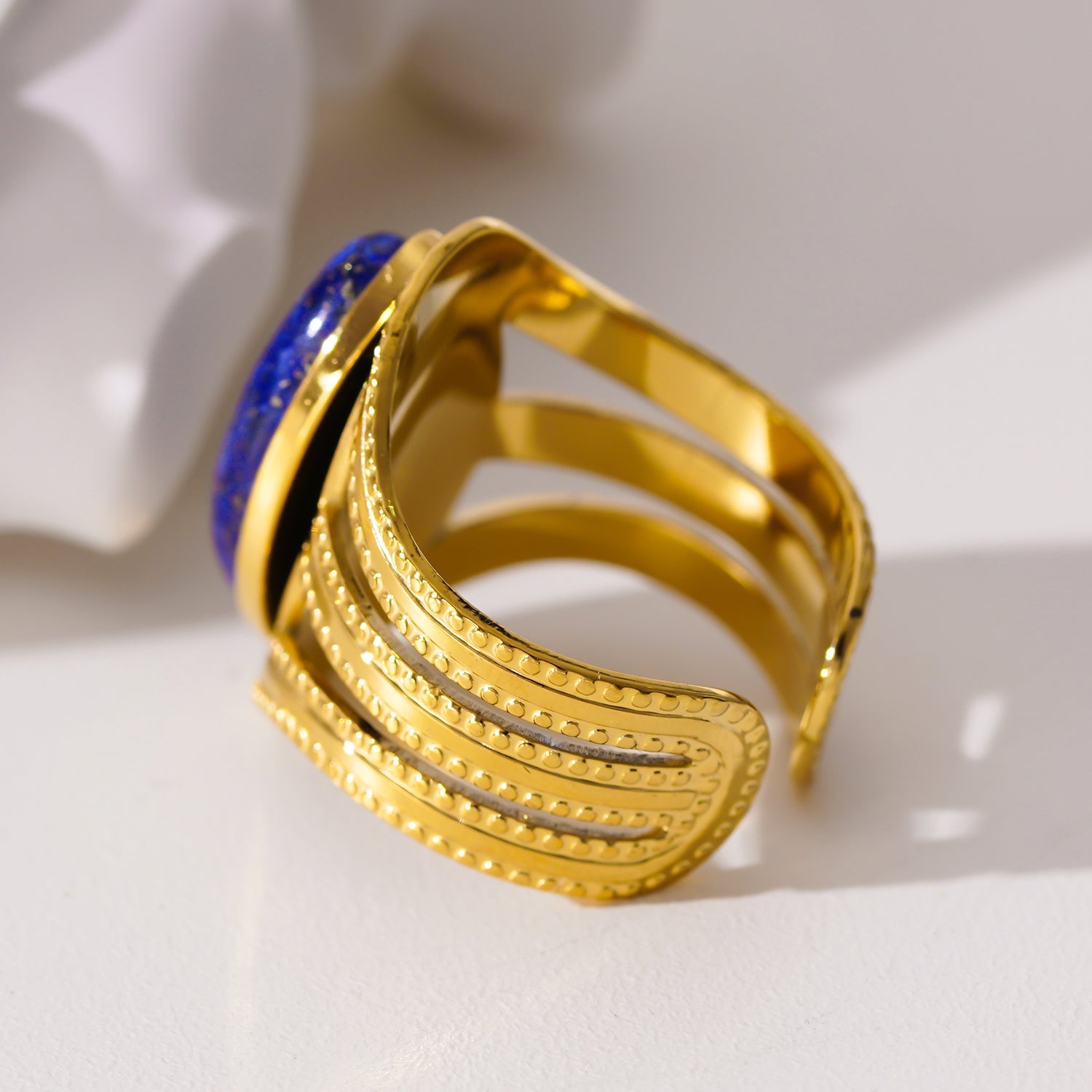 The lapis lazuli stone is cradled within a setting that exudes sophistication, surrounded by triple ornate bands that boast intricate detailing reminiscent of bygone eras. Each band is adorned with delicate motifs and filigree work, adding an extra layer of allure and refinement to the design.